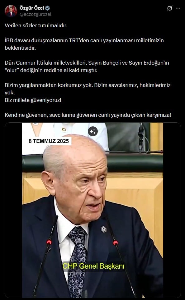“Verilen sözler tutulmalıdır. İBB davası duruşmalarının TRT’den canlı yayınlanması milletimizin beklentisidir. Dün Cumhur İttifakı milletvekilleri, Sayın Bahçeli ve Sayın Erdoğan’ın ‘olur’ dediğinin reddine el kaldırmıştır. Bizim yargılanmaktan korkumuz yok. Bizim savcılarımız, hakimlerimiz yok. Biz millete güveniyoruz! Kendine güvenen, savcılarına güvenen canlı yayında çıksın karşımıza!”