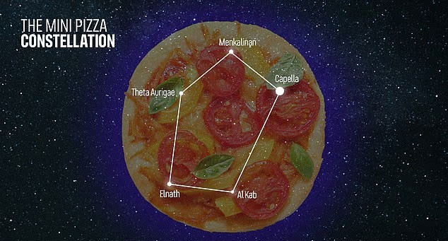 Mini Pizza: Bu şekil, Arabacı (Auriga) takımyıldızının Capella, Al Kab, Elnath, Theta Aurigae ve Menkalinan gibi ana yıldızlarından oluşuyor. Thompson, onu tespit etmek için akşam saatlerinde güneydoğuya bakılmasını öneriyor.
