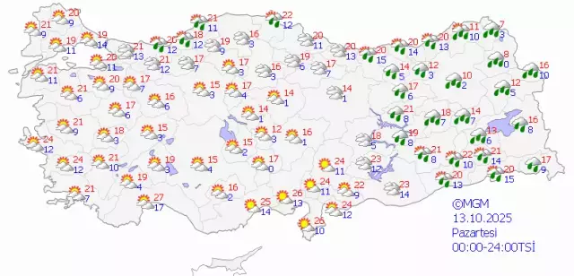MGM’nin yayımladığı hava durumu haritasına göre, Türkiye’nin doğu ve batı kesimleri arasında belirgin sıcaklık farkı oluşacak. Doğu illerinde sağanak ve kar yağışı etkili olurken, batıda ise parçalı bulutlu ve sakin bir hava hâkim olacak.